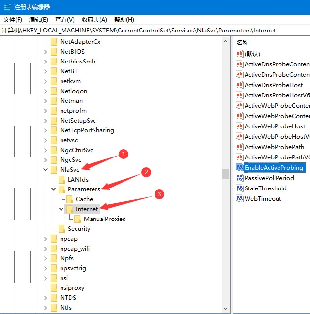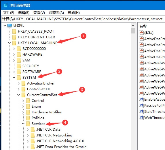 注册表中逐次找到以下路径,如果不清楚的话可以参考下图在注册表中一步步点进去.HKEY_LOCAL_MACHINESYSTEMCurrentControlSetservicesNlaSvcParametersInternet.