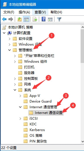 组策略编辑器打开后,依次点击“计算机配置”-“管理模板”-“系统”-“Internet通信管理”-“Internet通信设置”。