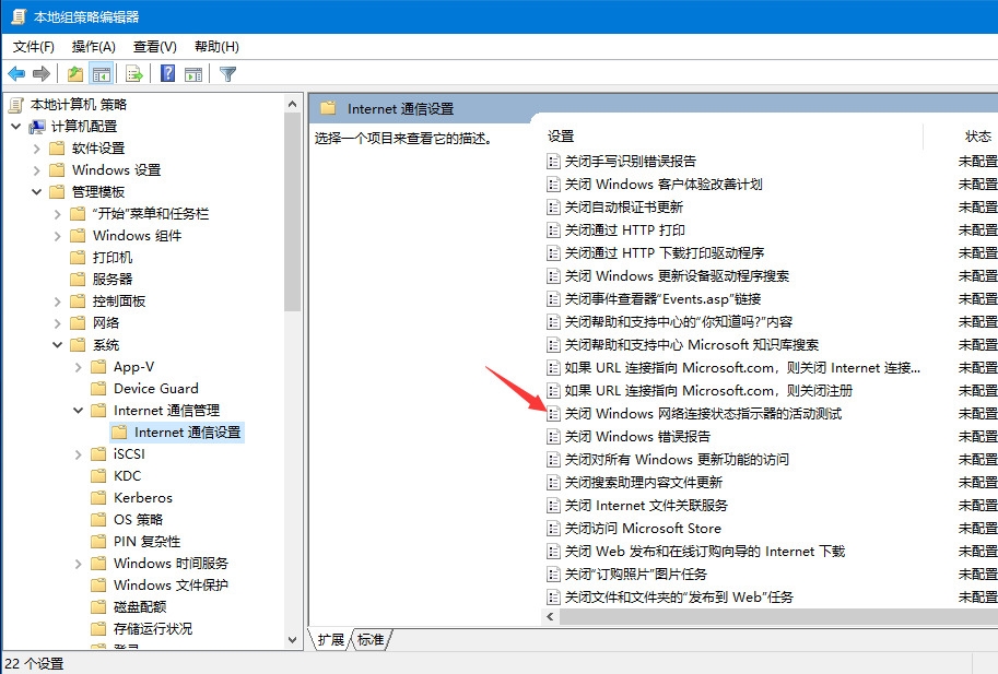 点击左边的“Internet通信设置”选项后中,双击右边选项中的“关闭Windows 网络连接状态指示器活动测试”.