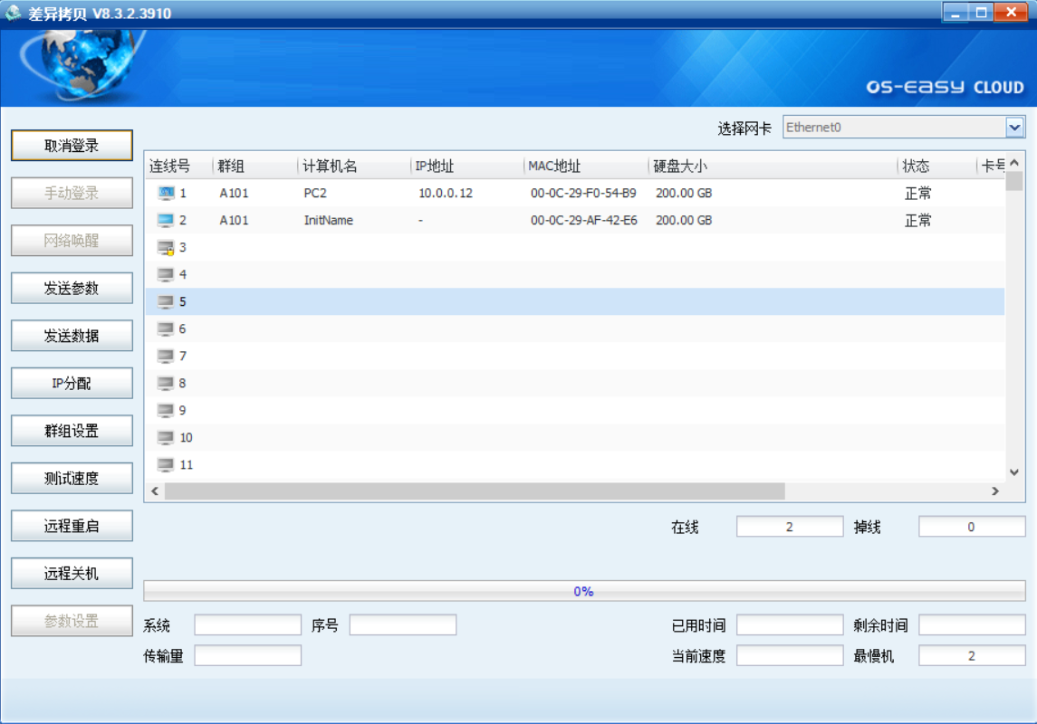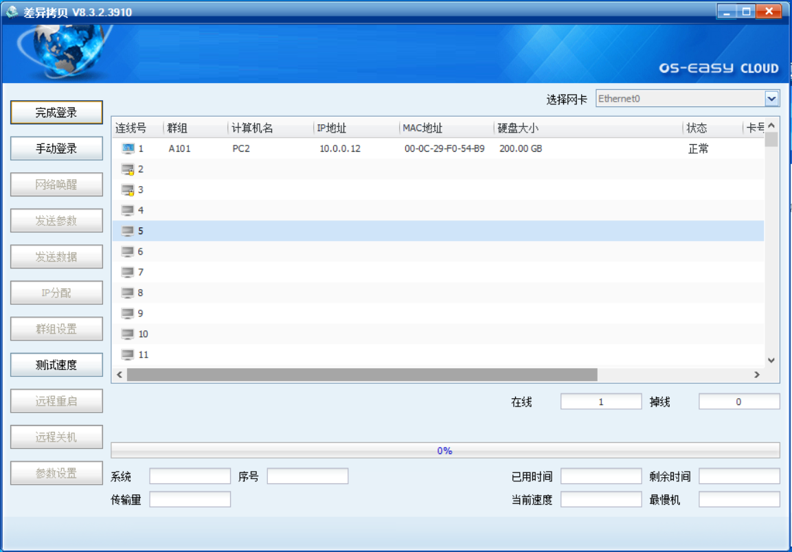 2.机房内其他机器开机启动,会自动连上述所讲的差异拷贝样机。机房内所有接收端状态连上样机时的状态如下两图:
