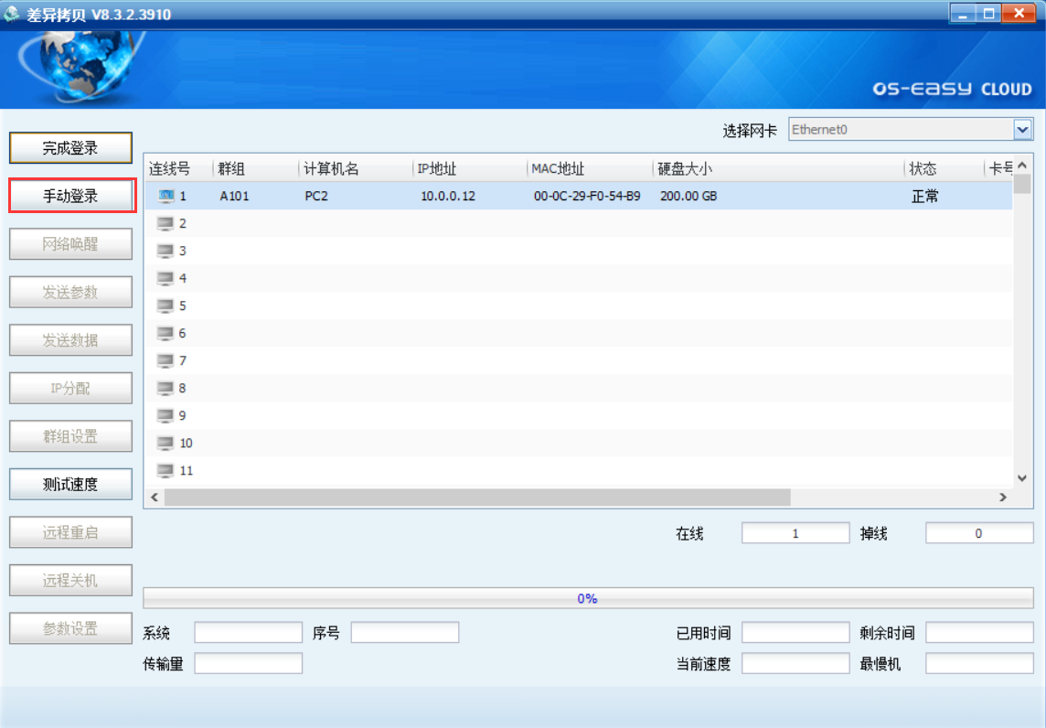 5.点击手动登录,开始为所有接收端机器连线号进行排序;
