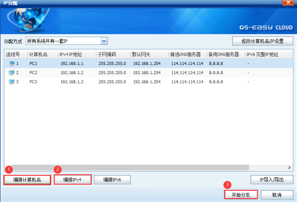 2.点“编排IP V4地址”和“编排计算机名”,再点“开始分发”;