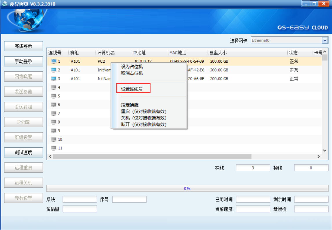 3.确认所有接收端机器都已连上差异拷贝发送端(即样机)后,右键点击发送端机器,修改连线号,如下图: