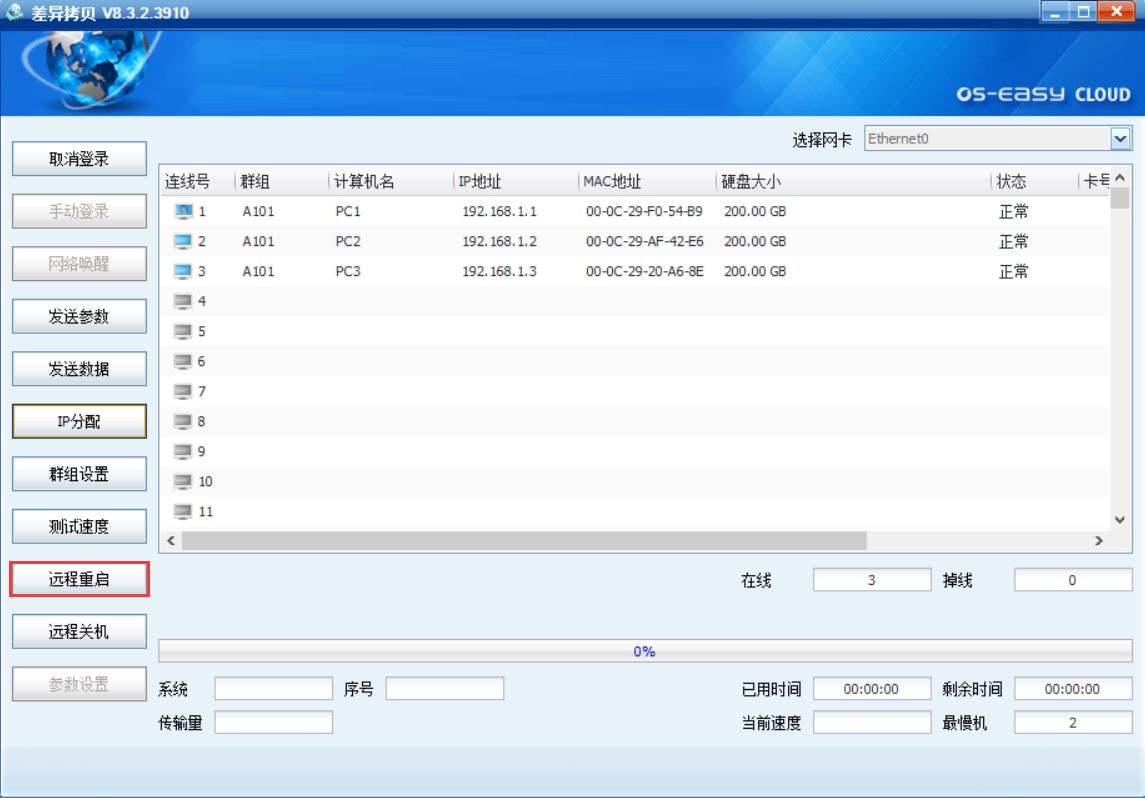 3.至此,IP分配完成,点击左侧远程重启,接收端会自动进入系统修改IP,修改完会自动重启(有几个系统会重启几次),发送端手动点击重启即可。
