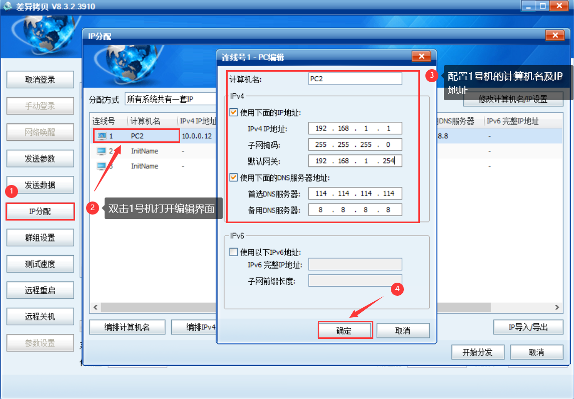 1.点击左侧功能栏中的IP分配选项,鼠标双击1号连线号机器,配置好计算机名、IP地址、网关等信息,点击确定;