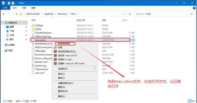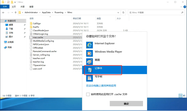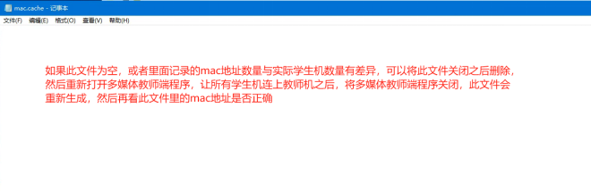 确认多媒体教师端中保存的学生端mac地址,在教师机中右击Windows开始菜单,选择运行,然后在运行框中输入%Appdata%回车,打开Mmc目录,找到里面的mac.cache文件,用记事本打开,看里面记录的mac地址数量是否跟学生机数量相同,如果该文件里记录的mac地址数据为空或者数量与实际学生机数量不一致,可将此文件删除,然后重新打开多媒体教师端程序让所有学生机连上之后,再把多媒体教师端程序关闭,此文件会再次生成,生成之后再看文件内容是否正常,具体操作如下图所示: