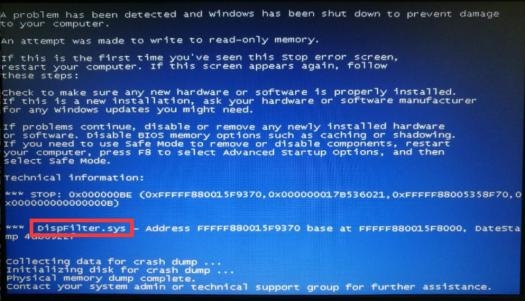 机房里面同传系统之后,进入windows系统,终端出现随机性蓝屏问题.在蓝屏的报错界面,一般会有简单的信息提示,如果发现蓝屏时候经常提示DispFiltet.sys错误,那么说明蓝屏问题跟这个文件有关,如下图标红部分.