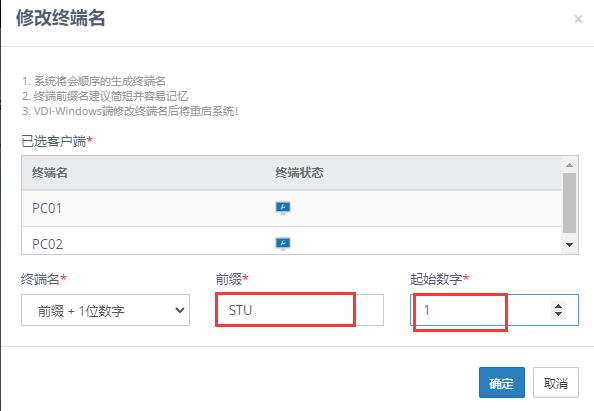 3、输入终端的统一前缀名称和起始数字,完成后点击确定。