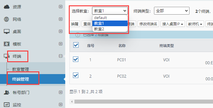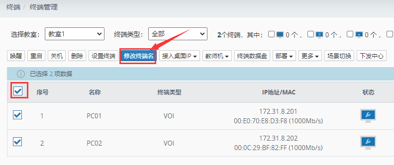 1、打开管理平台,点击终端管理,选择需要修改终端名和IP的教室。