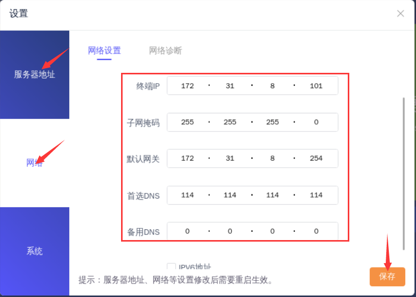 2、根据需求重新设置输入服务器IP或终端的IP地址,点击保存后重启终端即可生效。