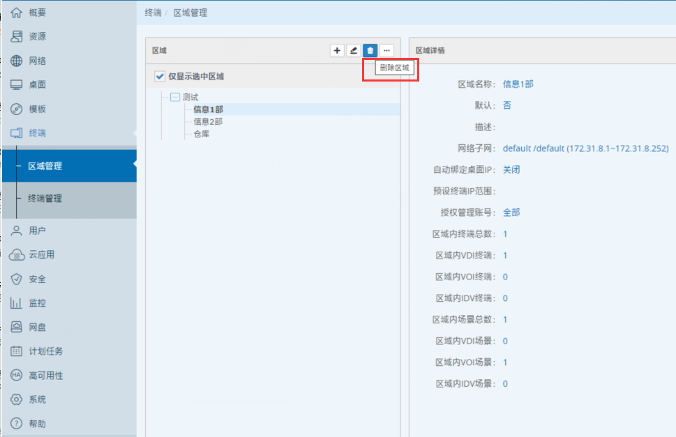 1、登入噢易云PC系统融合管理平台,找到『终端』→『区域管理』,选择对应的区域,→点击『删除』 ;