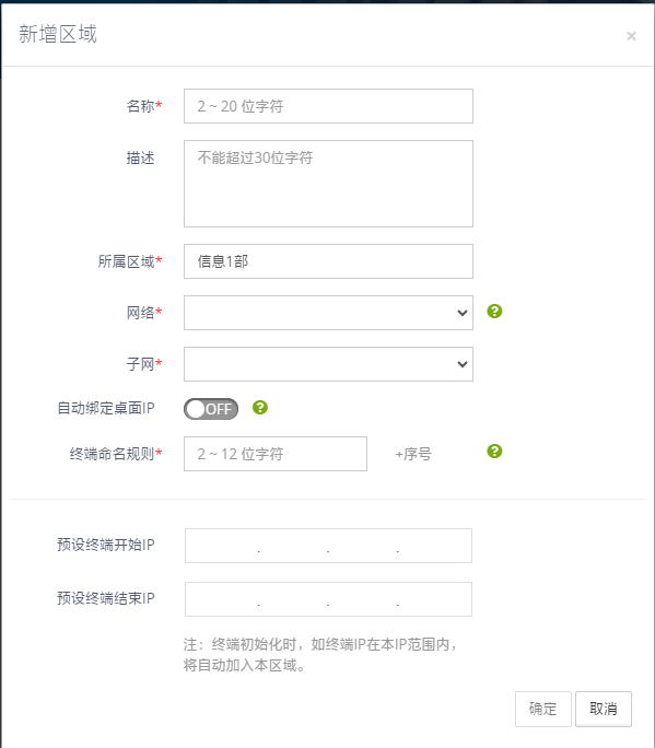 1、登入噢易云PC系统融合管理平台,找到『终端』→『区域管理』,点击『新增』→ 依次配置区域预设信息【区域名】、【描述】、【网络】、【子网】、【自动绑定桌面IP】、【预设IP】→『确定』 ;