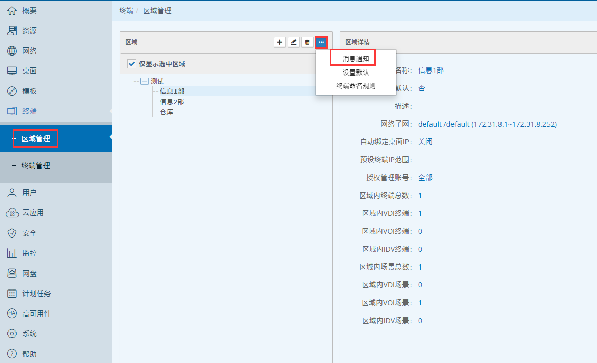 1、登入噢易云PC系统融合管理平台,找到『终端』→『区域管理』,选择对应的区域,→点击『消息通知』 ;