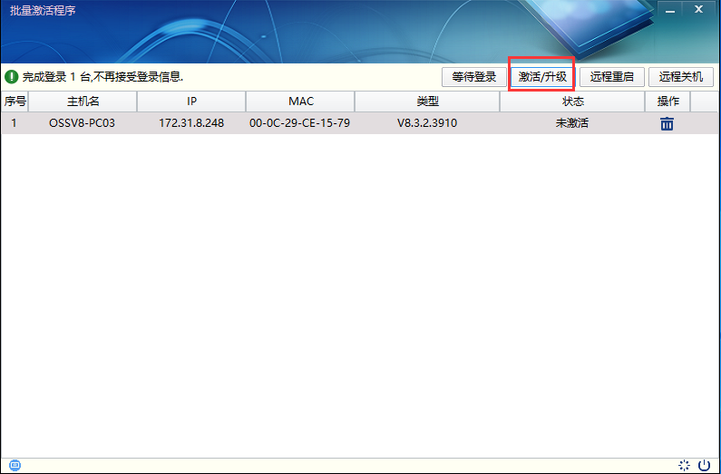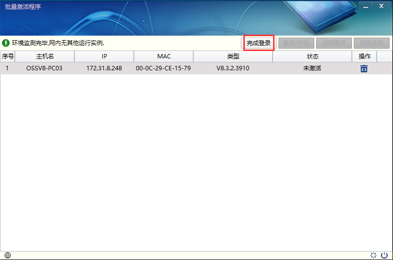 2.出现如下画面,它会自动把局域网中所有装有噢易产品的电脑全部扫描过来,并显示在线;然后点击“完成登录”,再点全部激活,(如下图)会进入到在线激活和连线激活界面