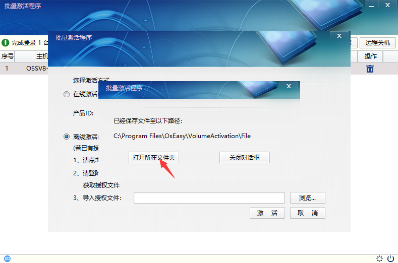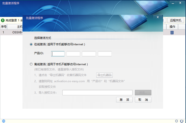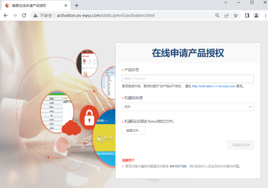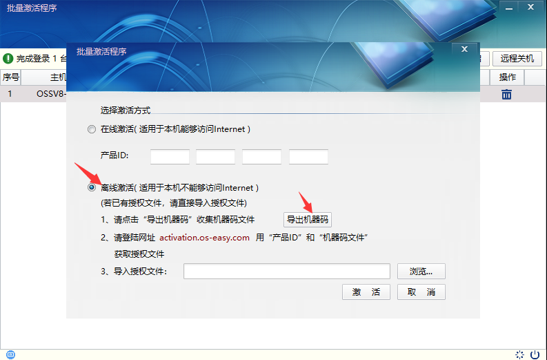 3.如果您是采用离线激活:至少要找到一个能上网的地方,因为需要上网打开我们噢易的激活网站(http://activation.os-easy.com/ 或http://activation-v1.os-easy.com/),导入并上传机器的机器码信息来获取激活授权文件