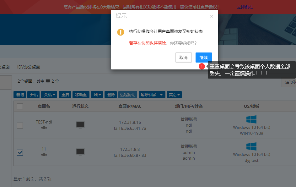 在已有的VDI办公环境中,偶尔会出现一些因为软件安装冲突、系统蓝屏等各类现象,导致桌面系统无法正常启动的情况,或者您想快速清除掉某个桌面的个人数据,我们的云管理平台提供了针对办公桌面的重置功能,能迅速帮您恢复操作系统如新的一样。