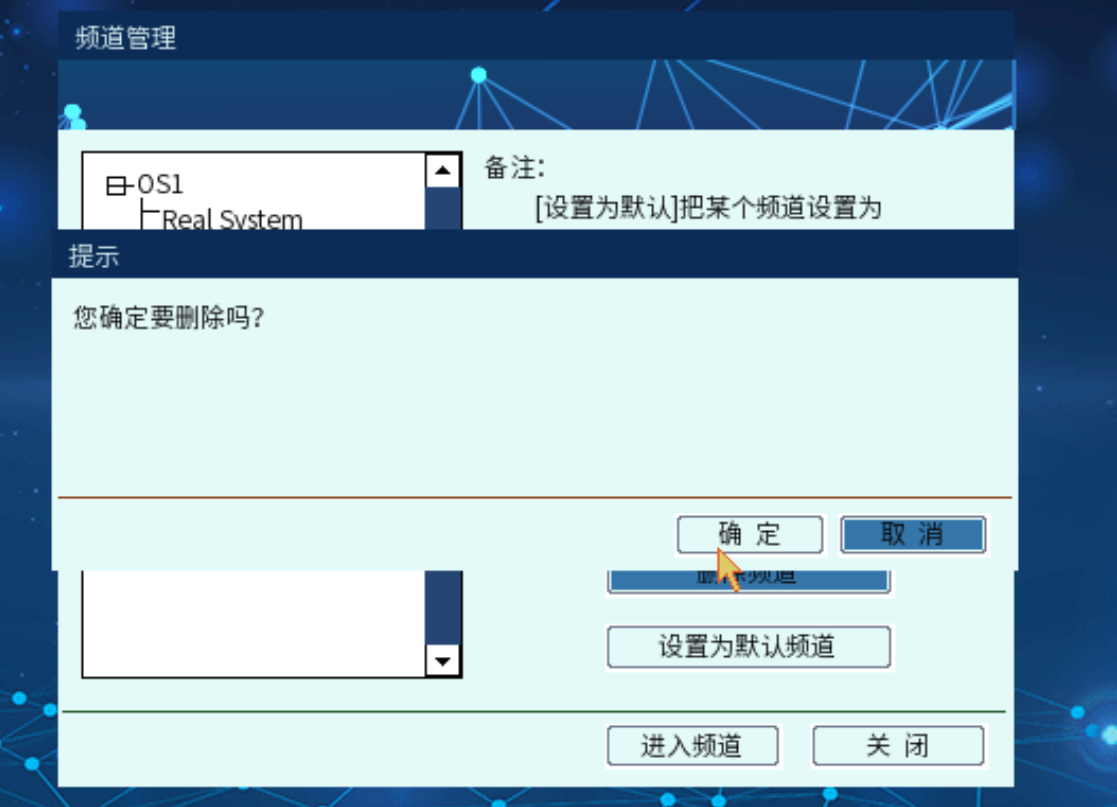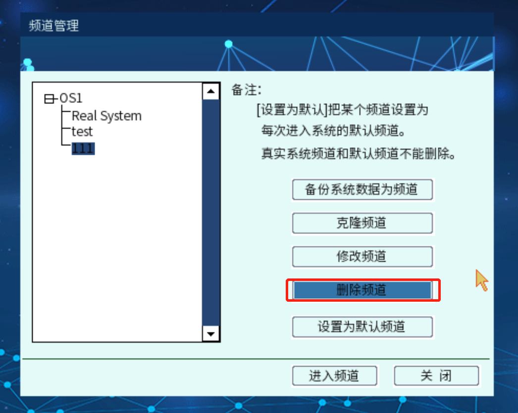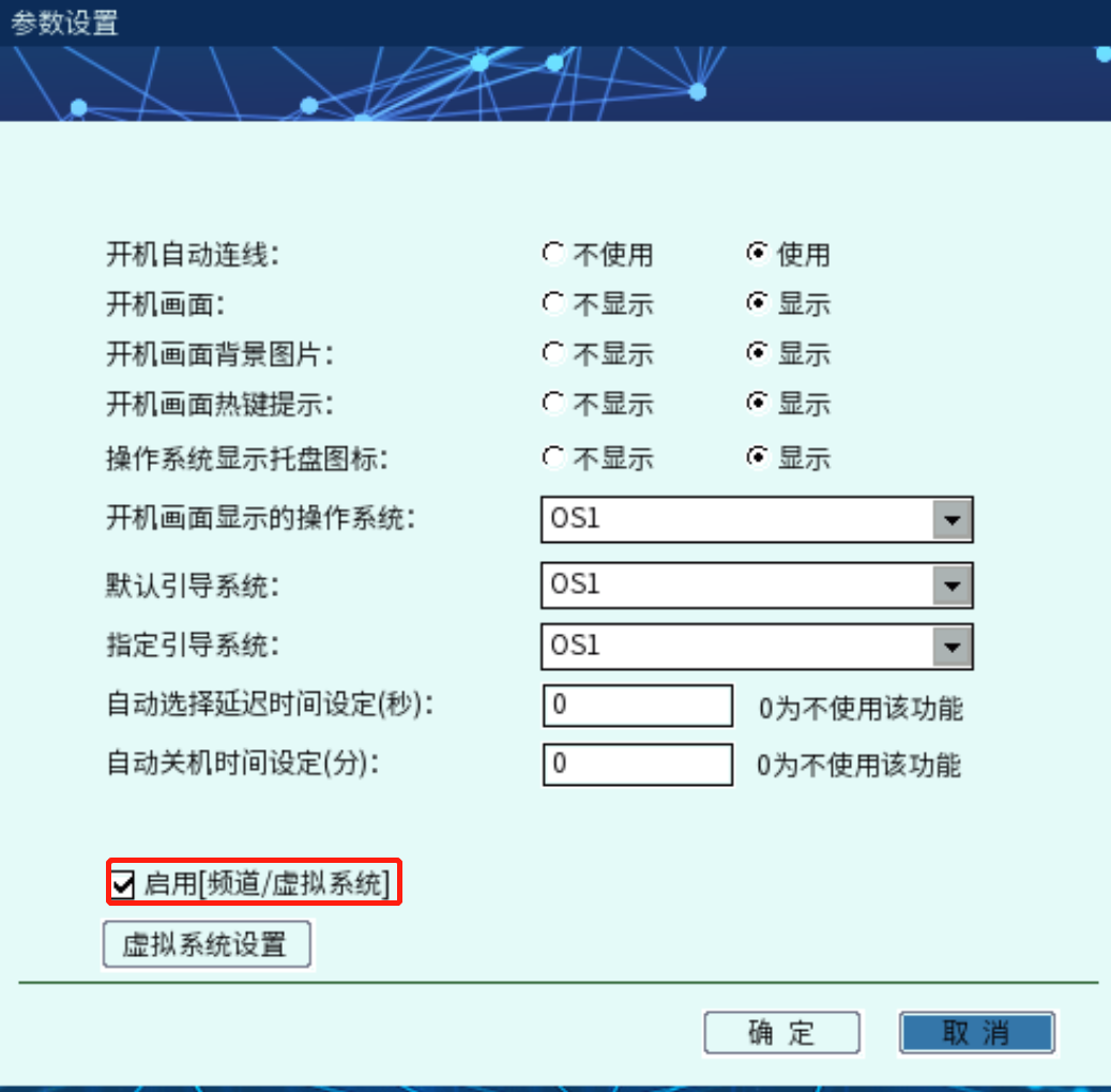 在开机画面显示:勾选表示该频道在开机界面操作系统选单显示出来,方便用户选择进入;不勾选表示该频道在操作系统选单界面不显示。