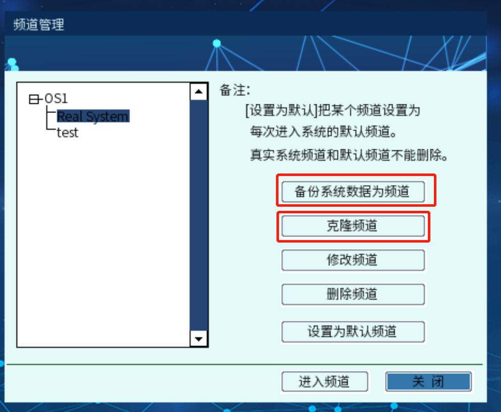 ② 选中想要创建频道的系统, 如果在保护模式下对系统做了更改,重启后想保留系统做过更改的状态为基础创建频道,可以单击【备份系统数据为频道】,如果不想保存之前的更改的状态,可以选择【克隆频道】,重启前对系统的更改不会保留。