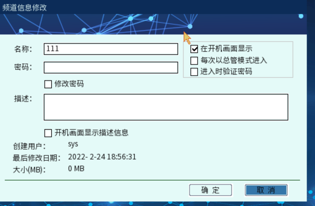 进入时验证密码:在进入频道时需要输入密码验证。勾选表示在开机操作系统选择菜单界面,选择某个频道进入时需要输入创建时设置的密码,无密码或密码错误不能进入该频道;不勾选表示进入频道时不验证密码。(如需更改频道密码,请启用密码验证后,在密码框内输入新密码。)