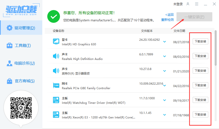 需要安装的驱动少,就单个点击安装,如果需要安装的驱动较多,可以点一键安装,尽量使用稳定版本驱动.如果机器没有网卡,会让先安装网卡驱动,然后再联网扫描缺失驱动.