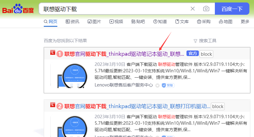 机房如果使用的品牌机的一整套驱动,推荐下载官方的驱动文件安装,兼容性最佳.在百度上搜索对应的品牌驱动下载网站,根据机器型号或序列号找到对应驱动下载.下文以联想品牌机为例.