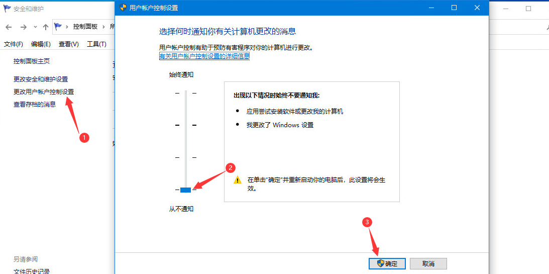 双击控制面板-系统和安全-安全和维护-更改用户账户控制设置,改为从不通知.