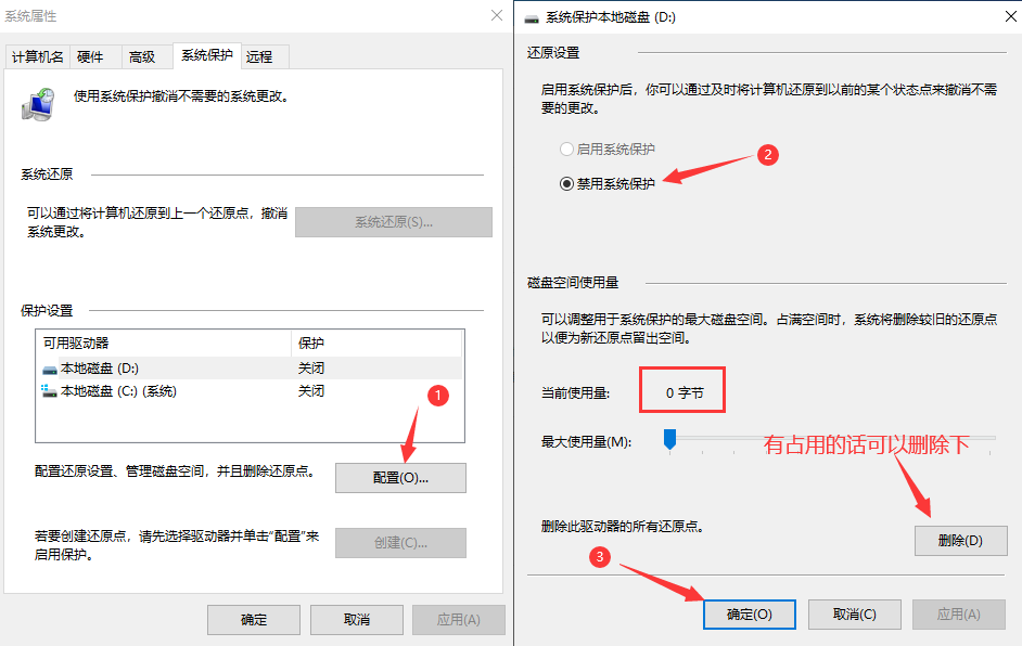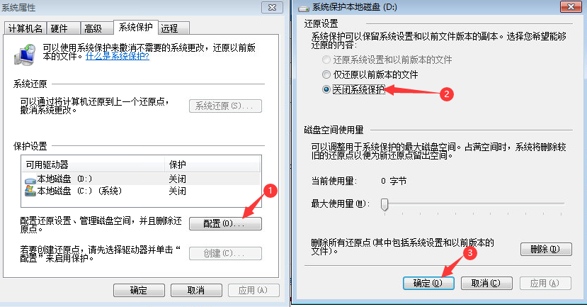 点击计算机-右键属性-点击高级系统设置-点击系统保护-选项卡-选择磁盘-点击配置,选择关闭系统保护.