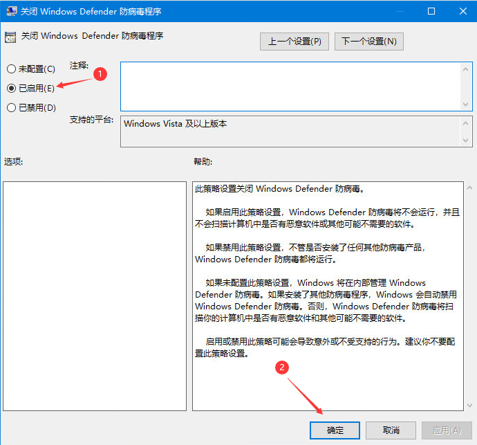 3.如果要关闭Windows defender,则将“关闭 Windows Defender”项设置为“已启用”即可。