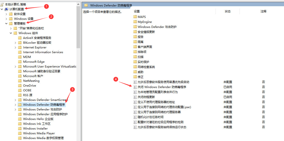 2.依次打开计算机配置-管理模板-Windows组件-Windows Defender.