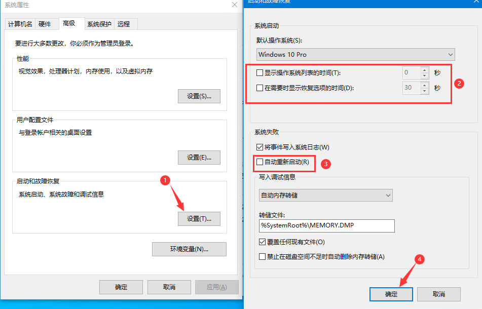 点击计算机-右键属性-点击高级系统设置-高级-点击启动和故障恢复设置选项,关闭显示系统列表时间和显示恢复选项时间,勾选自动重启电脑.