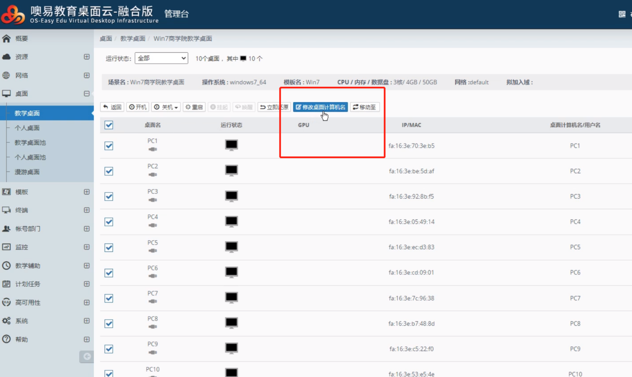 3.待桌面全部关机后,进入场景,全选桌面点击修改桌面计算机名