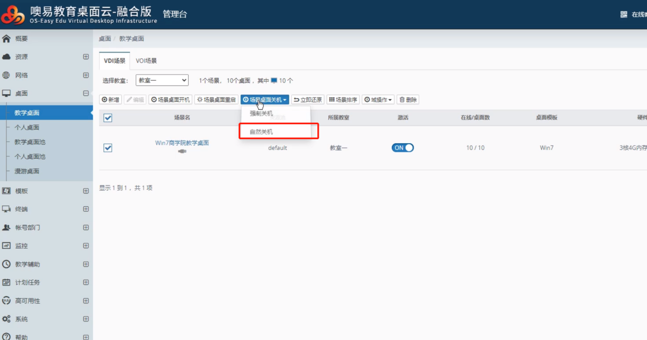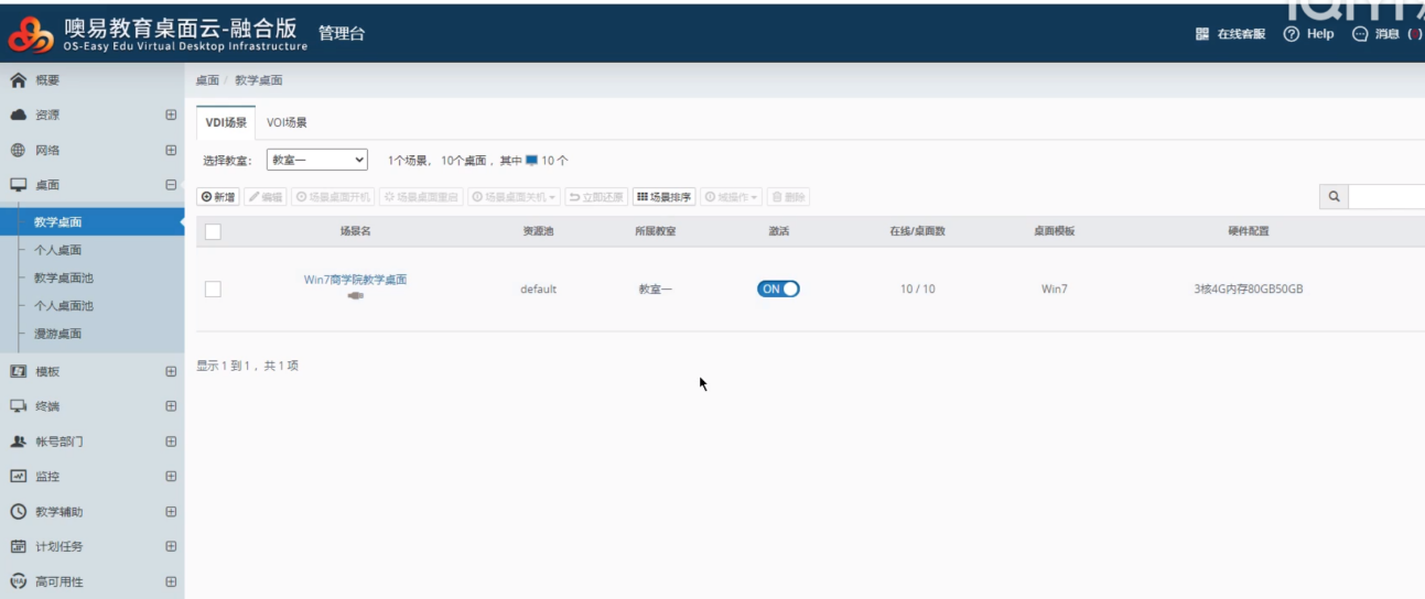 1.打开管理平台,点击菜单栏中的桌面——教学桌面,点击vdi场景