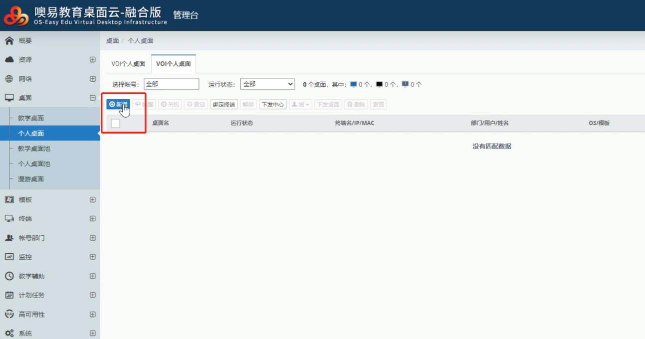 1.登录管理平台,在菜单栏中点击桌面,选择个人桌面,点击新增