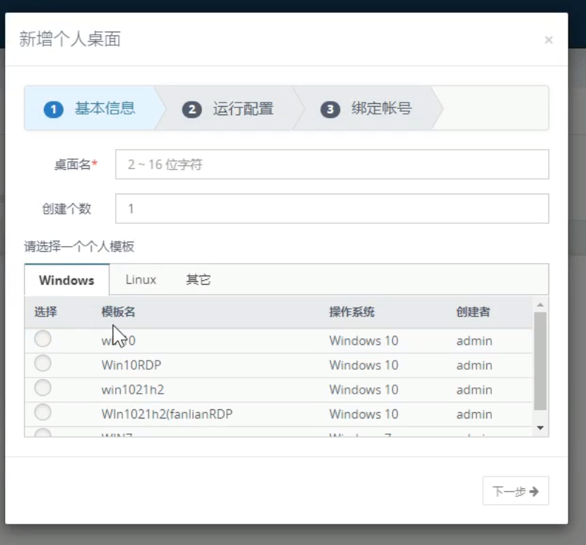 2.输入桌面名称及创建个数,选择一个已创建好的个人模板进行创建桌面,选择完成后点击下一步