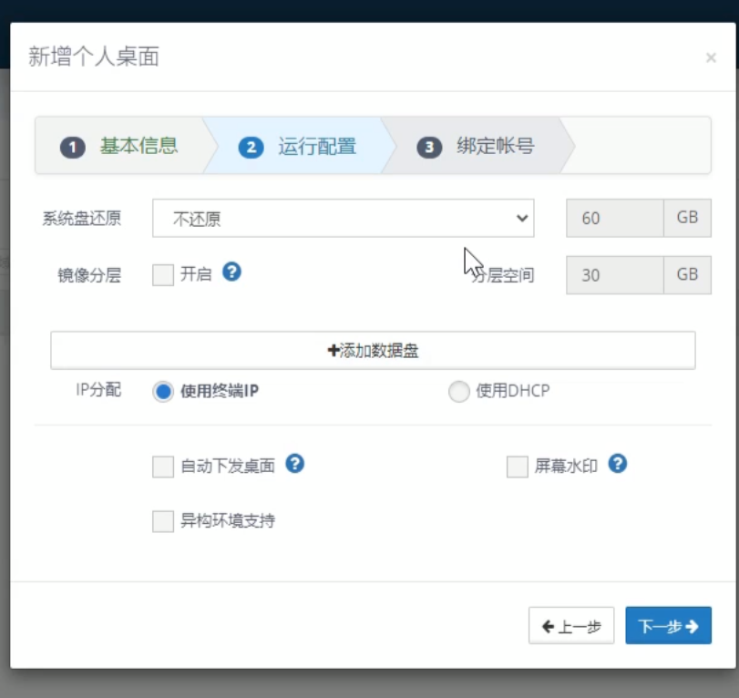 3.根据需求选择系统盘的还原方式,IP设置,若需要添加数据盘可点击“添加数据盘”,根据需求可勾选自动下发桌面和屏幕水印