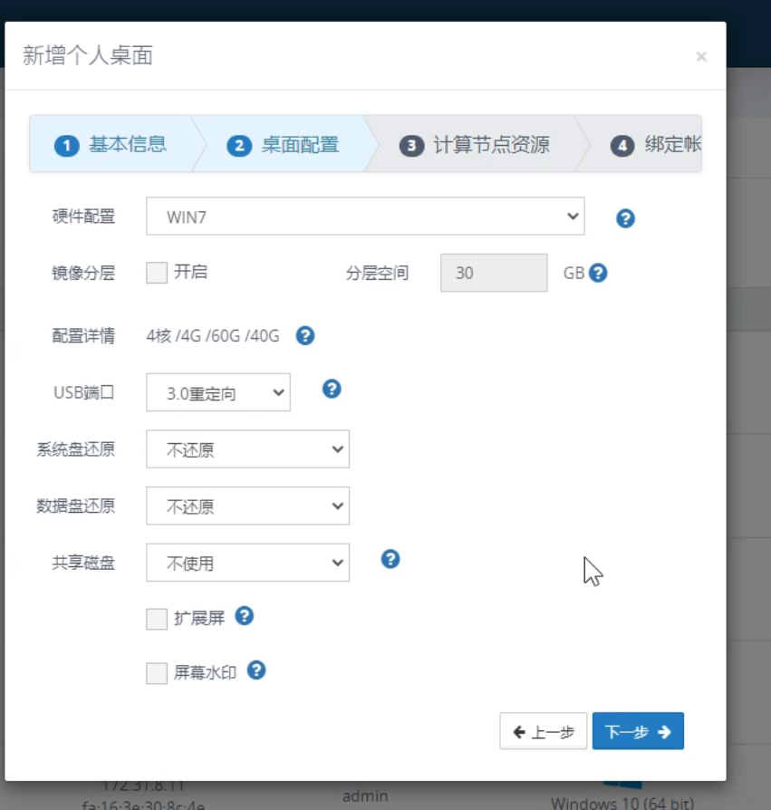 3.根据需求对桌面的硬件配置、系统盘与数据盘的还原模式及是否使用数据盘等进行配置,完成后点击下一步