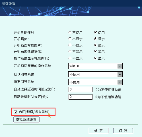 在使用虚拟系统管理之前,请先确认所使用的系统已经安装好底层及上层驱动程序,并在底层客户端F10参数设置中已经将“启用【频道/虚拟系统】”功能选项打勾,如下图: