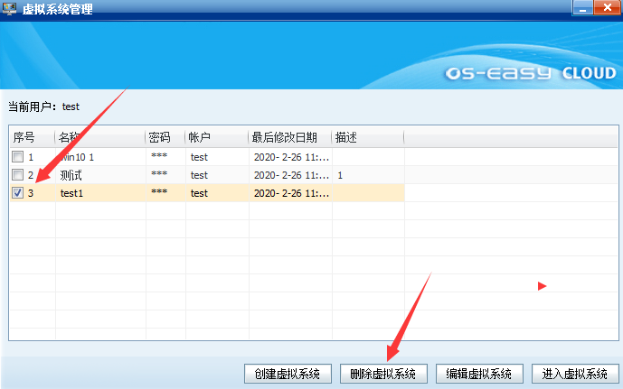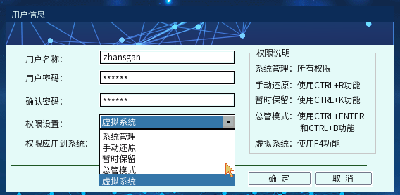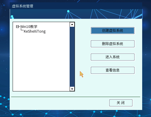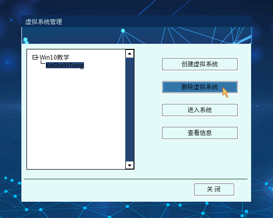 鼠标勾选虚拟系统序号,单击【删除虚拟系统】键,验证密码后,系统将删除选中的虚拟系统。鼠标勾选虚拟系统名称,单击【进入系统】键,验证该虚拟系统密码后,将进入选中的虚拟系统,系统为开放模式,不保护,用户进行的操作都将保留下来。