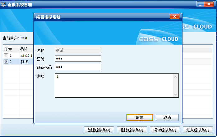 勾选某一个虚拟系统,点击【编辑虚拟系统】,可以修改指定虚拟系统的密码和描述。