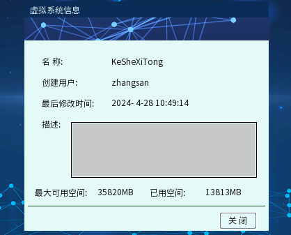 鼠标勾选某个虚拟系统名称,单击 【查看信息】键,能够清晰的了解该虚拟系统的名称 、描述 、创建者 、创建时间 、所占空间大小等信息。