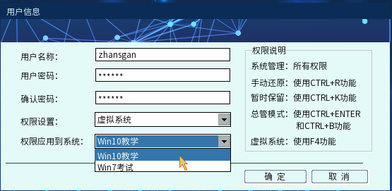5、在“权限应用到系统”一栏选中该用户需要用到的系统,这里选中了哪个系统该账号就可以基于此系统去创建虚拟系统,可以多选,点击确定用户账号就创建完成了。