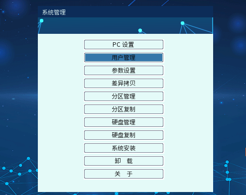 - 各虚拟系统管理员之间的权限是平等的,不能对其他虚拟系统管理员所创建的虚拟系统进行管理。在开机操作系统选单界面,按 F10 键到系统管理界面,在【用户管理】中创建一个虚拟系统权限用户。详细步骤如下: