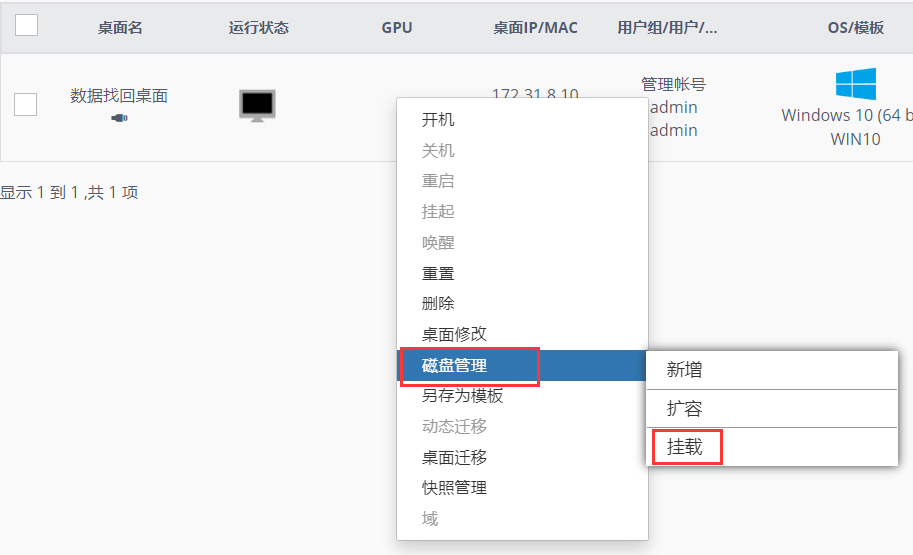 3.建完之后先不开启此桌面,右键新桌面,选择磁盘管理-挂载;