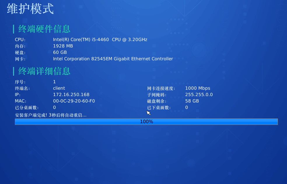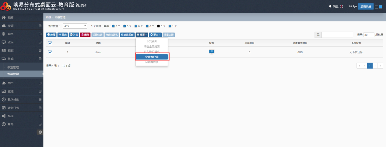 4.该终端连入默认教室中,在终端管理/该默认教室/部署功能中执行安装客户端(安装客户端时分配的IP确保是能和服务器能正常通信的IP段)
