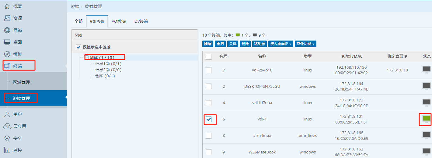 1、打开云桌面管理平台并进行登陆,找到左侧功能栏【终端—终端管理】,进入之后,选择对应的部门,找到需要修改的终端并进行勾选;