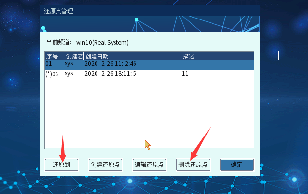 鼠标点选还原点列表,单击【删除还原点】,删除选中的还原点。初始还原点和最后一个还原点限制删除。鼠标点选还原点列表,单击【还原到】,弹出提示信息确认后,提示框退出,自动进入系统,系统状态还原到所选还原点创建时的状态