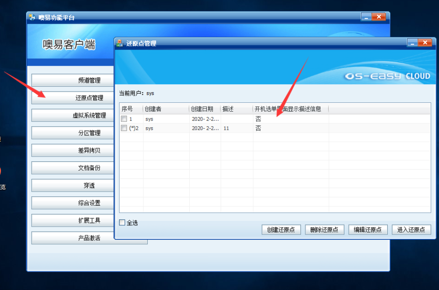 在windows端的功能平台管理里面,点击【还原点管理】,和底层操作完全一样。可以在windows端控制。