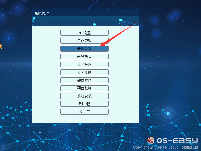 底层进入:开机后在OSS底层系统选择界面,按【F10】键,输入管理员账号和密码(默认账号为sys,密码为空),然后选到【参数设置】,按回车进入。