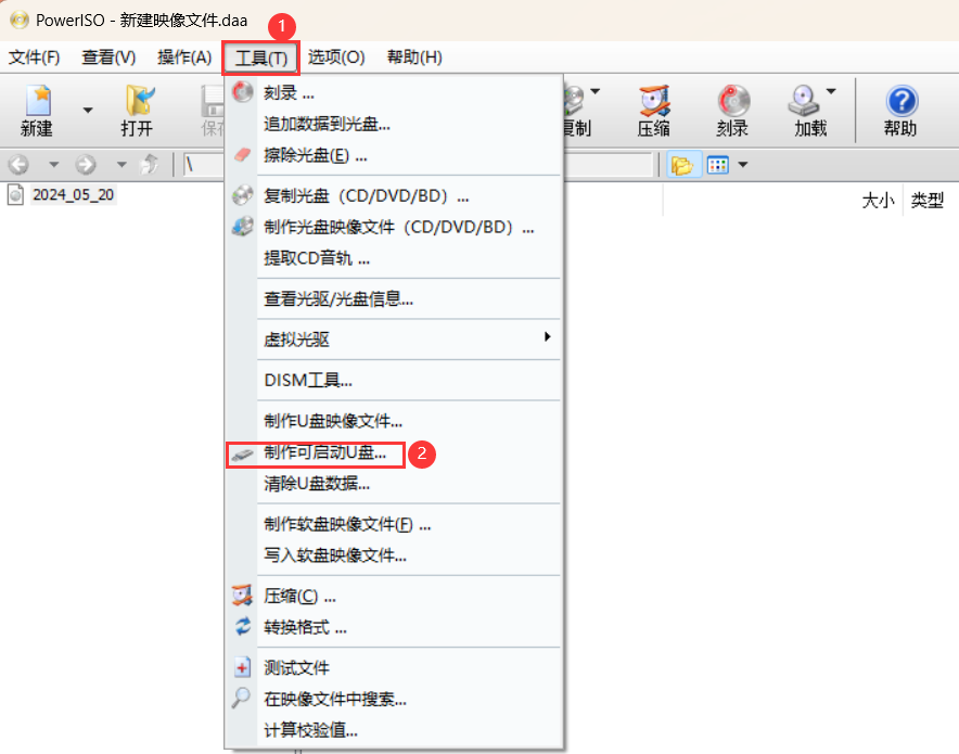 2.插入一个8G以上的U盘,使用powerISO工具制作VOI急救盘:打开powerISO软件,点击【工具】-【制作可启动U盘】。