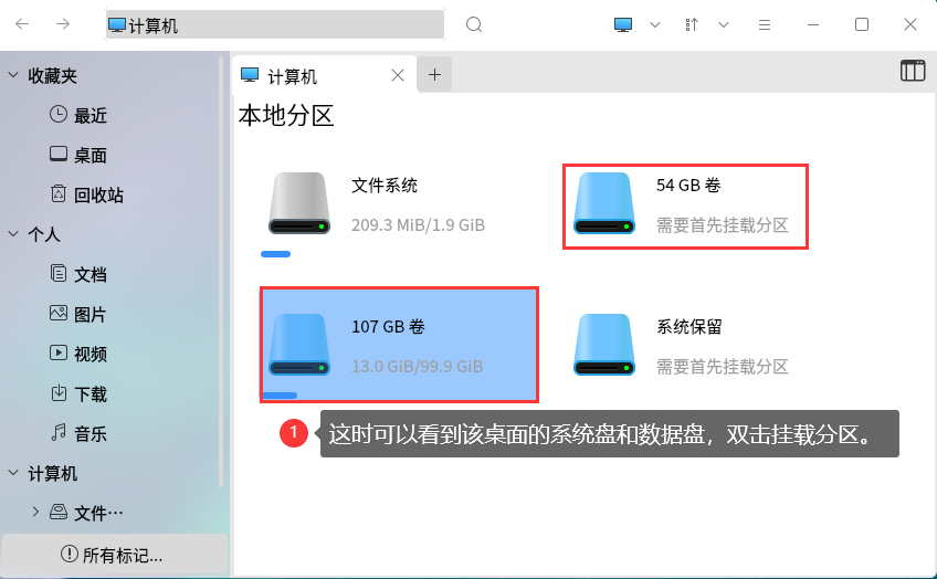 6.打开后可以看到桌面的系统盘和数据盘,双击分区进行挂载。